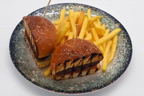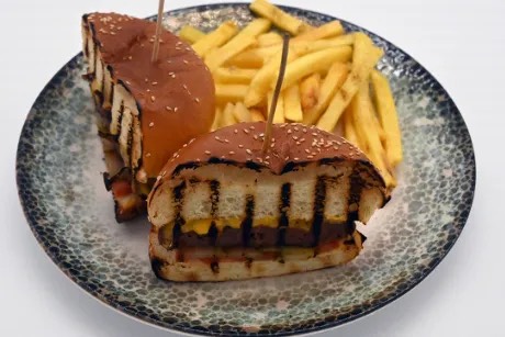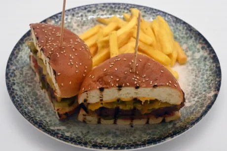 Patates kızartması, turşu, domates, cheddar peyniri ve özel sos ile